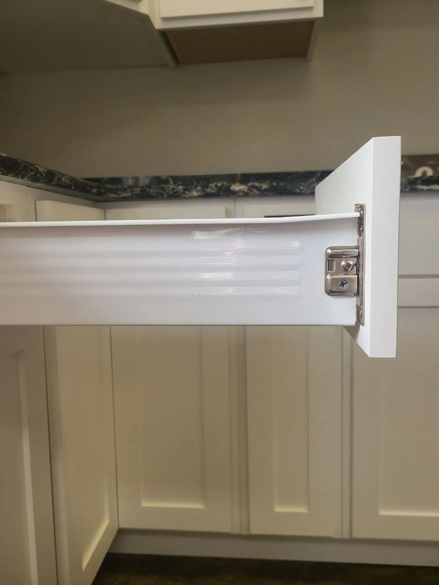 The metal sides of this drawer box also serve as slides/runners. The backs and bottoms of the drawer are built of white melamine, with the finished drawer front being attached by brackets. This style is typically used in commercial settings.