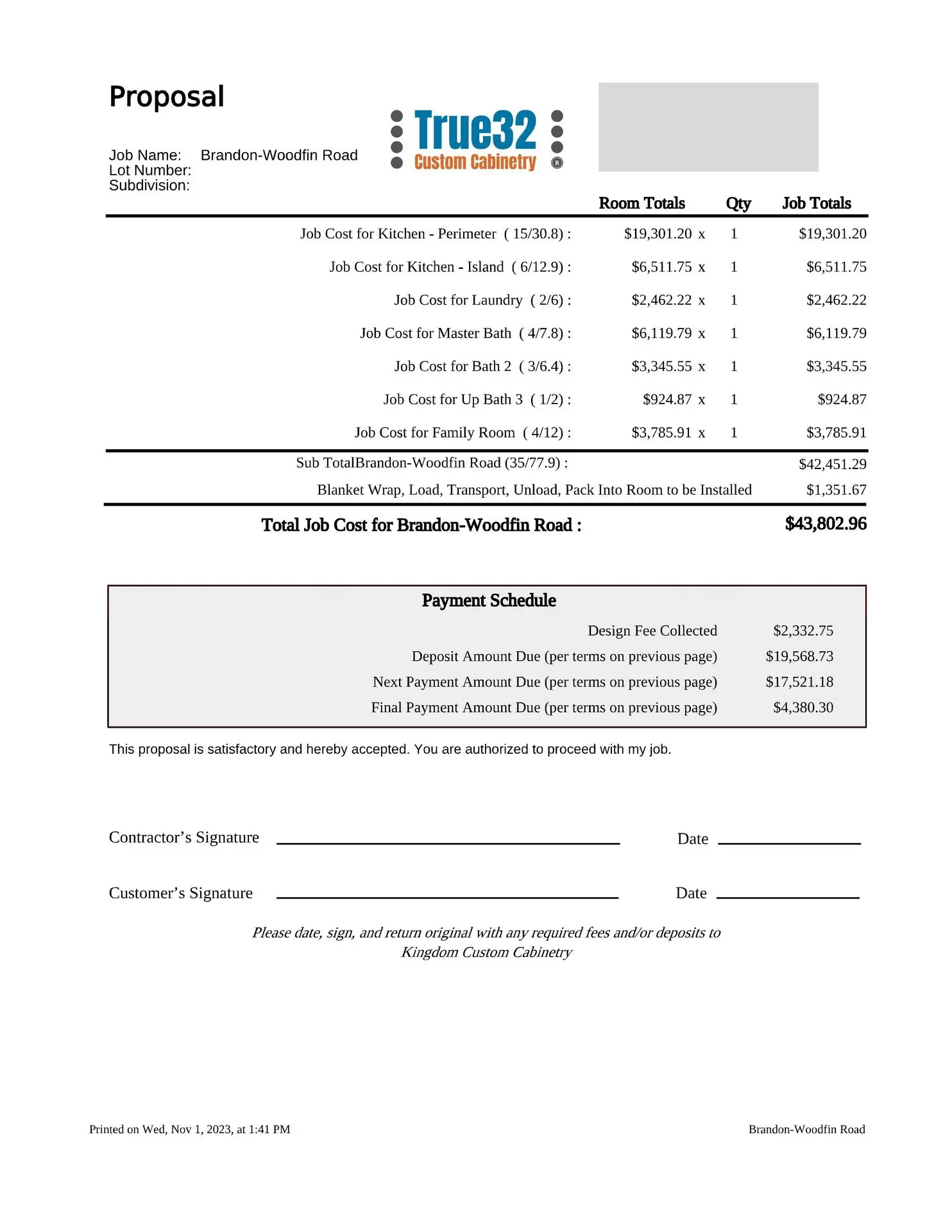 Once your design is complete, we will ask you to schedule a design review meeting at our showroom. At this meeting, we will present you with our drawings and review them wall by wall and room by room. We will redline the drawings with any additions, changes, or subtractions and note any discrepancies that are discovered. If there are no discrepancies, additions, changes, or subtractions, or once they have been dealt with, we will then proceed to produce a detailed proposal for your project. As with the estimate, this proposal can be e-mailed or mailed to you, or we can meet at our showroom to review it in detail depending on your preferences.