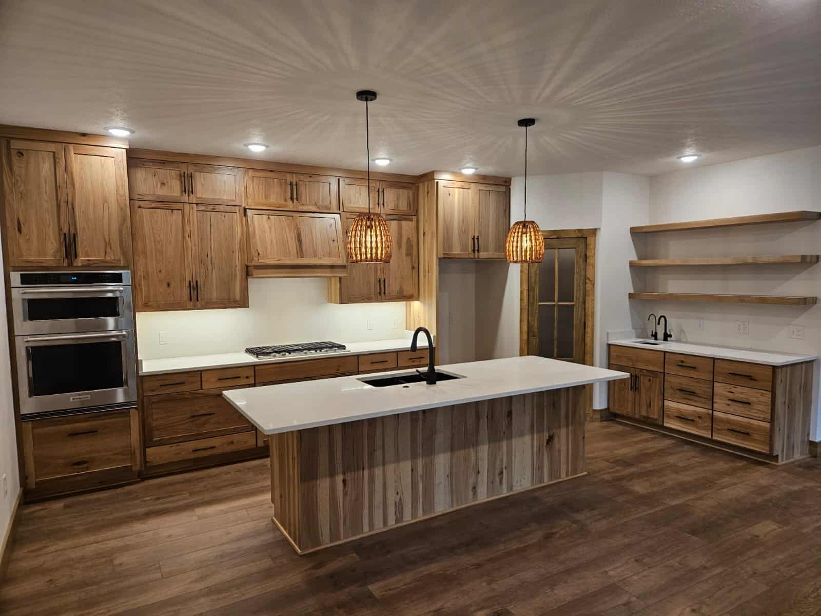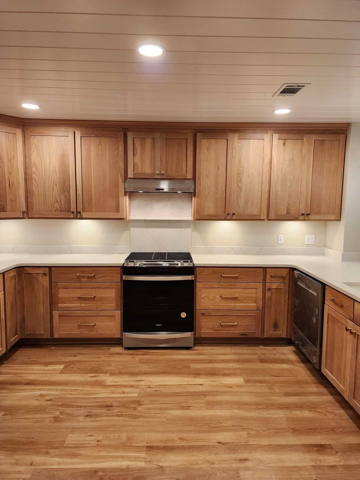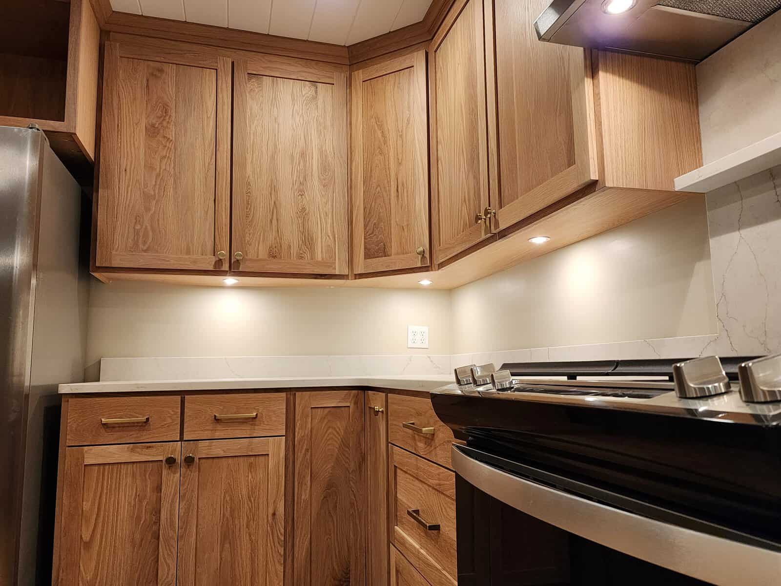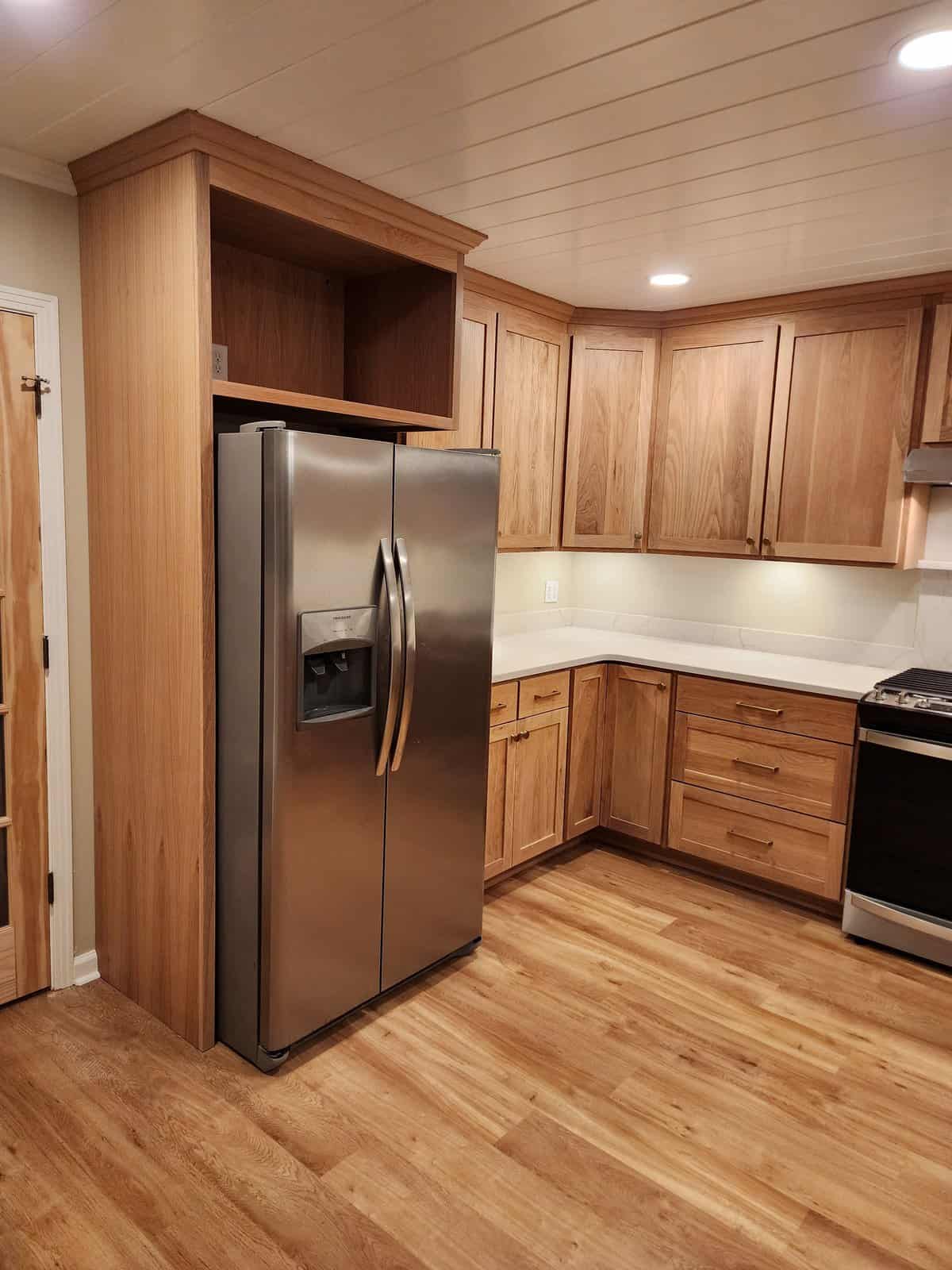 Shaker cabinets are made from a five-piece door, which comprises a four-piece frame with a flat panel in the center. These cabinets are traditionally made from high-quality American wood, but it's now fairly common to see them manufactured from MDF as five-piece or one-piece doors and painted in pretty much any color under the sun. For a more modern look, some homeowners will paint the upper cabinets one color, and then use a different paint or wood stain for the lower cabinets.