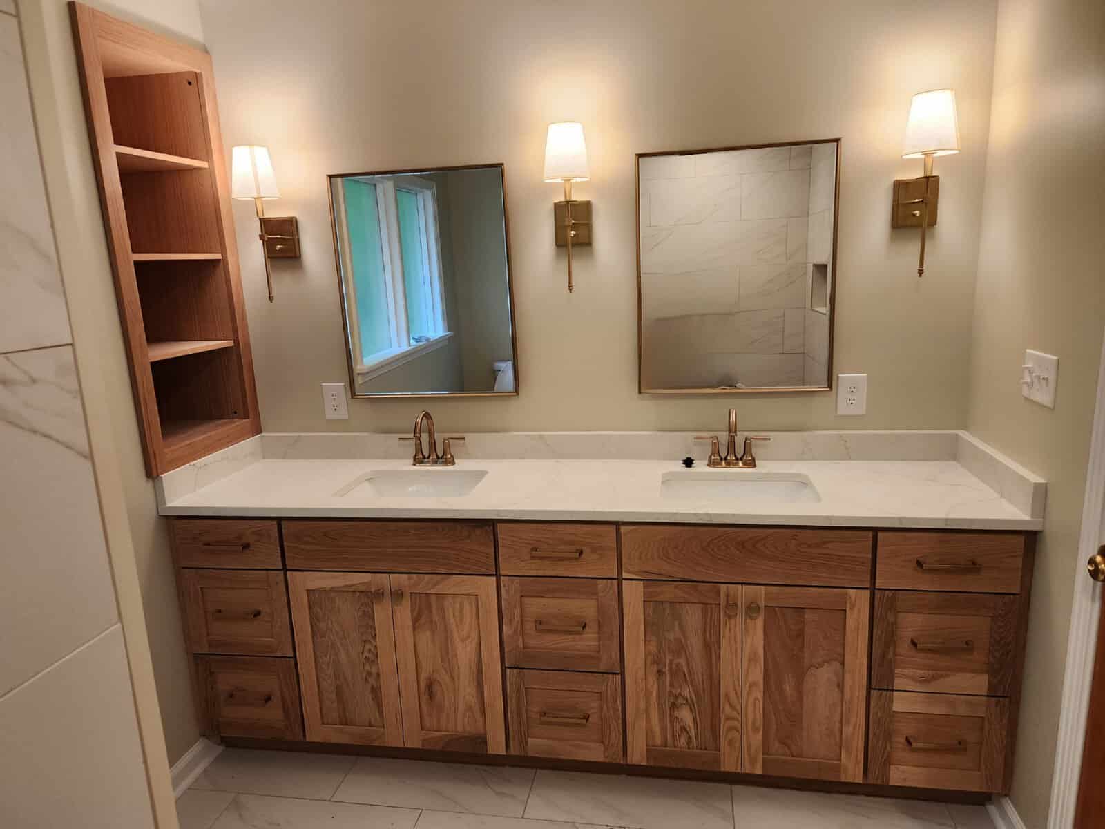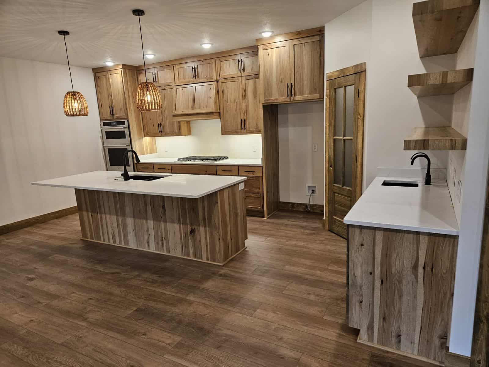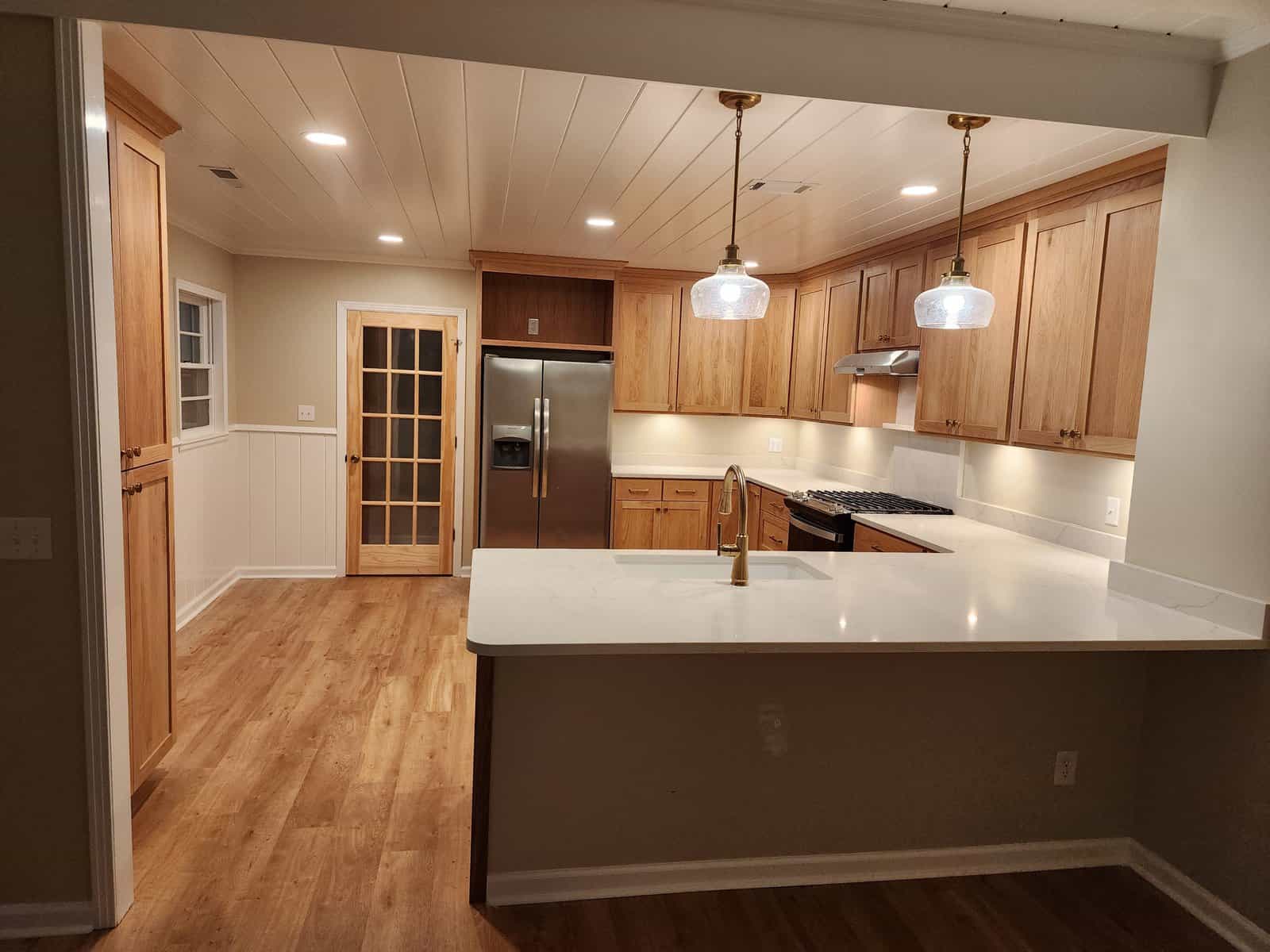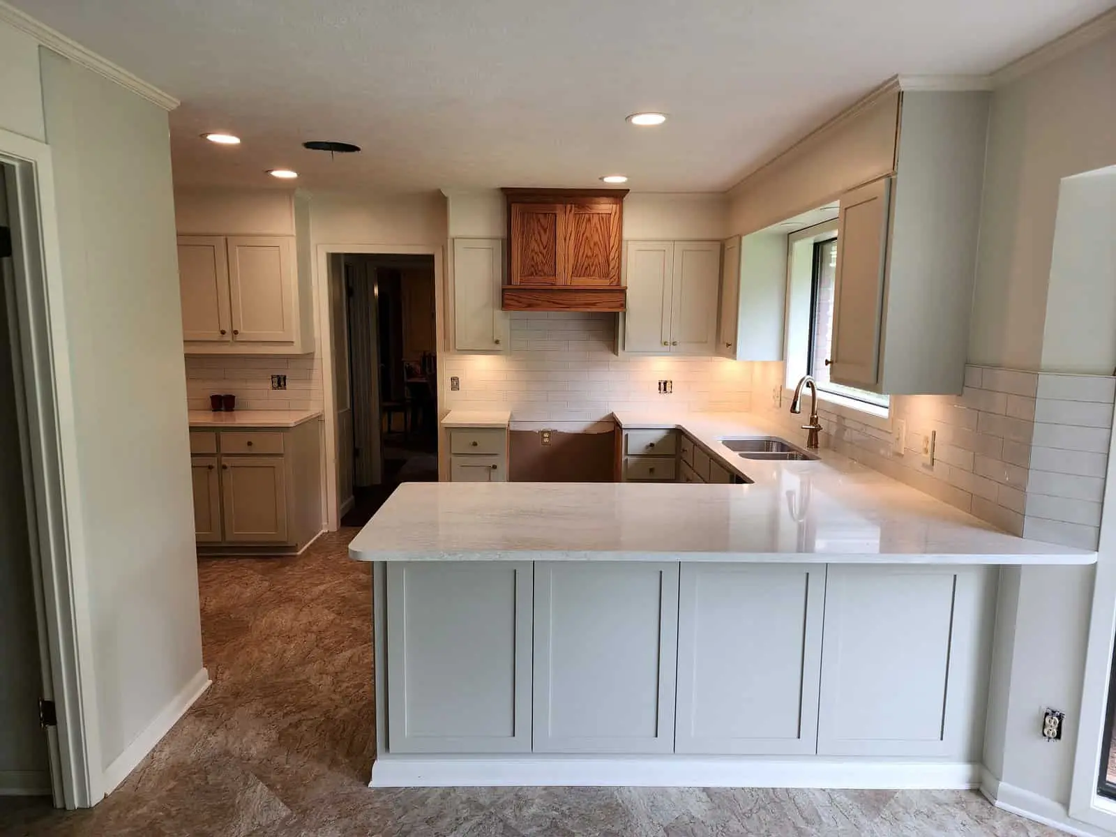 Shaker cabinets are made from a five-piece door, which comprises a four-piece frame with a flat panel in the center. These cabinets are traditionally made from high-quality American wood, but it's now fairly common to see them manufactured from MDF as five-piece or one-piece doors and painted in pretty much any color under the sun. For a more modern look, some homeowners will paint the upper cabinets one color, and then use a different paint or wood stain for the lower cabinets.